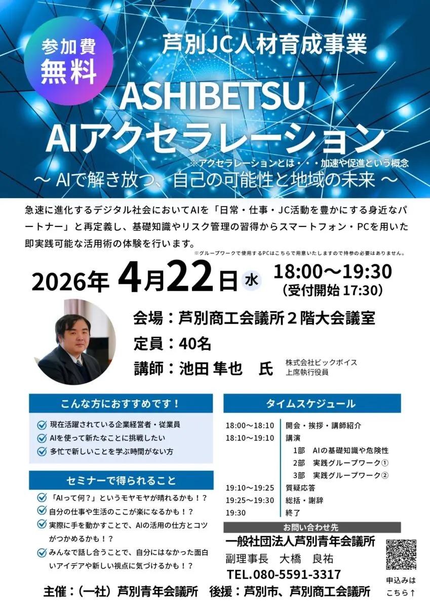自分が所属している芦別青年会議所が、AIをテーマにしたセミナーを企画しました。